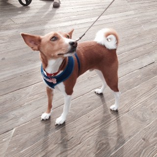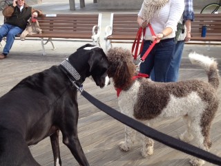 Today the temps hit the high 60s, perfect for a good stroll. It took us 4 1/2 hours to walk our usual route (we can do it in an hour and a half on a weekday) because there were so many big, little, unusual and cool dogs and fun people. I started counting benches and got up to EIGHT and got distracted by great people, most with a nice dog, so I gave up. For today, anyway. This is Zuma trying to “get small” so as not to intimidate the teeniest dog on the Boardwalk.