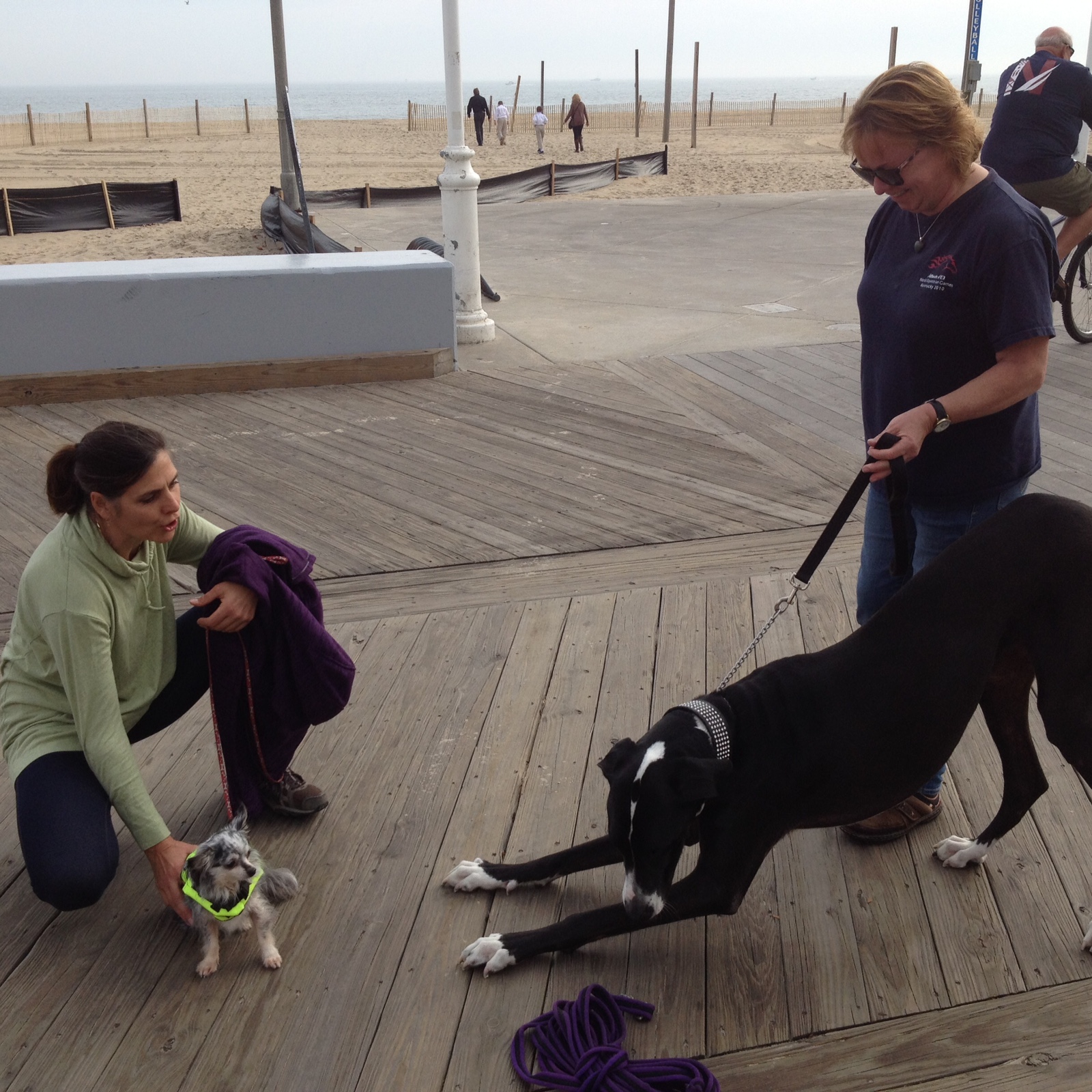 Today the temps hit the high 60s, perfect for a good stroll. It took us 4 1/2 hours to walk our usual route (we can do it in an hour and a half on a weekday) because there were so many big, little, unusual and cool dogs and fun people. I started counting benches and got up to EIGHT and got distracted by great people, most with a nice dog, so I gave up. For today, anyway. This is Zuma trying to “get small” so as not to intimidate the teeniest dog on the Boardwalk.