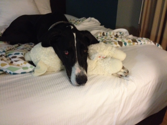 Zuma and her Lamb Chop stuffed toy that Emma gave her. They have taken over Doug’s bed since he’s not here right now. It was all Lamb Chop’s idea.