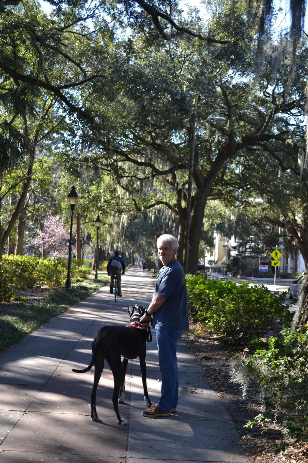 Zuma and Doug and I walked around Forsythe Park both yesterday and today; Zuma LOVES it there and we met lots of dogs and people. Savannah is a very dog-friendly city and at every turn there are dogs, joggers, walkers, all soaking up the warm weather. It was 78 degrees F yesterday and today a little less than that with a mild breeze. Perfect walking weather. We are up to 5 miles a day now, according to the pedometer Doug purchased for me. This helps me stay on track. It’s a gorgeous trek around the famous park with the Spanish Moss dripping from the trees, camellias, roses and azaleas in bloom. Freshly planted pansies smiling at the sunshine.