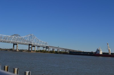 We learned a lot on our trolley tour: New Orleans didn’t take the worst of it when Hurricane Katrina hit in the early morning hours of August 29, 2005, but it got hammered. When the levees broke, the city flooded ankle-deep to knee-deep in places. There was water damage a-plenty, but not like the areas outside the city. Within the city, the water wreaked havoc on the plumbing in the city and there were areas with severe water damage. New Orleans is still rebuilding, restoring. Old Man River races along beside the city, ‘rollin’ down to the sea’:
